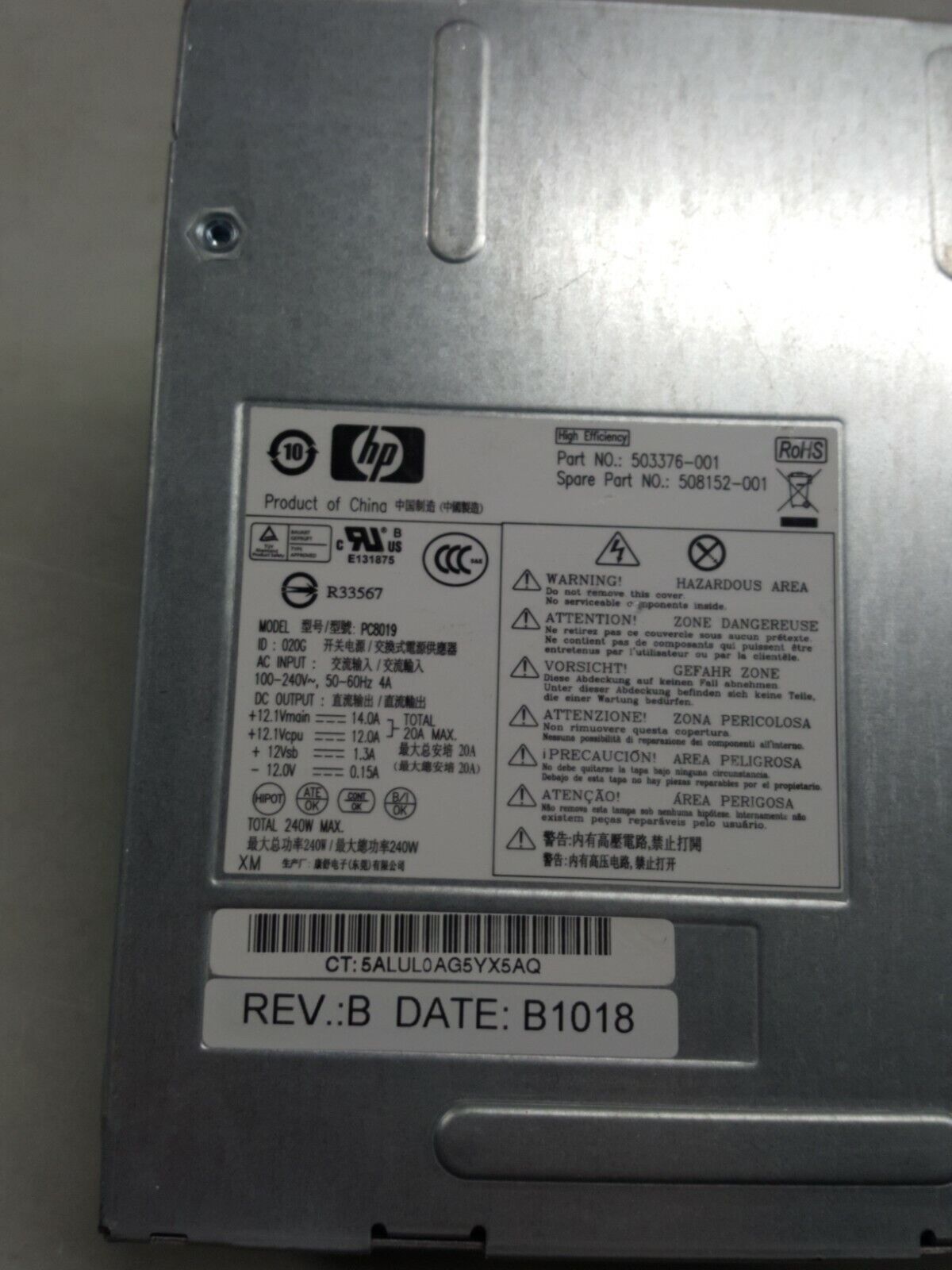 Fuente HP 503376-001 508152-001 PC8019 240W Retirado de Equipo en Uso Garantia 12 Meses Descripción $59.00 $87.00 Agregar